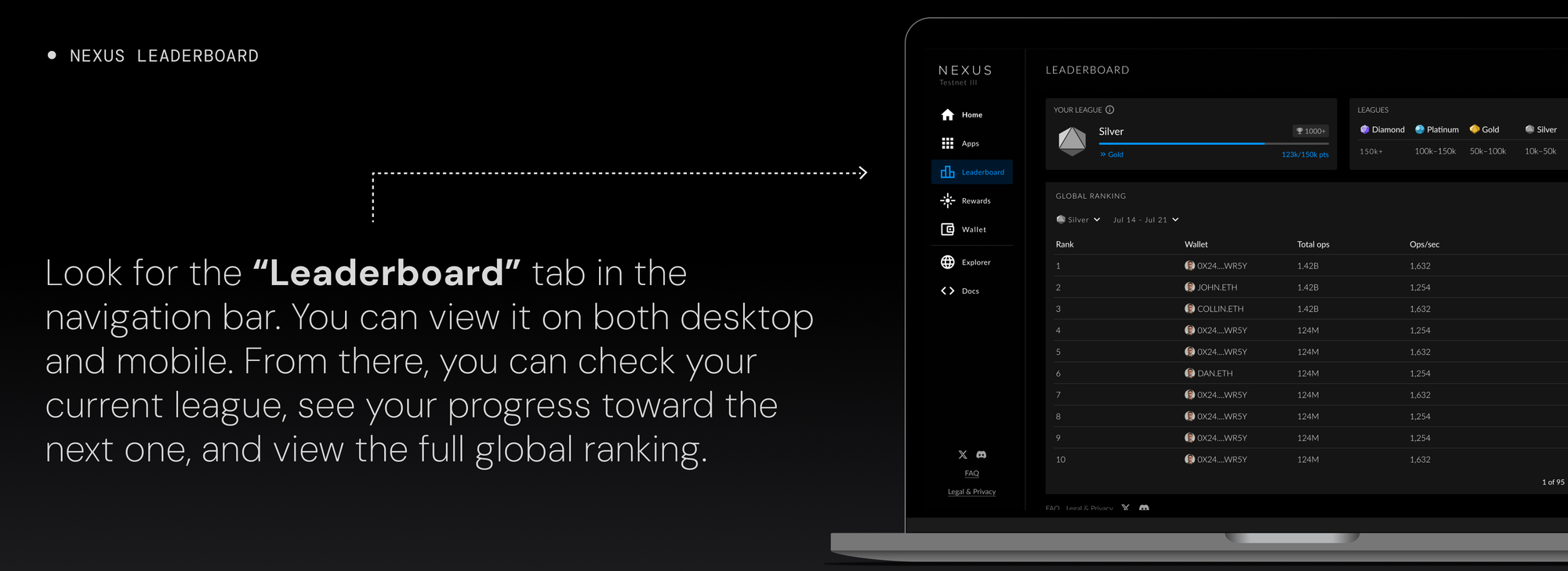 Nexus OS rolled out its first week of leaderboard-based rewards, using a hybrid formula that combines a base reward with performance-weighted bonuses. A new mobile navigation design also brings a cleaner, more intuitive feel to the proving interface.