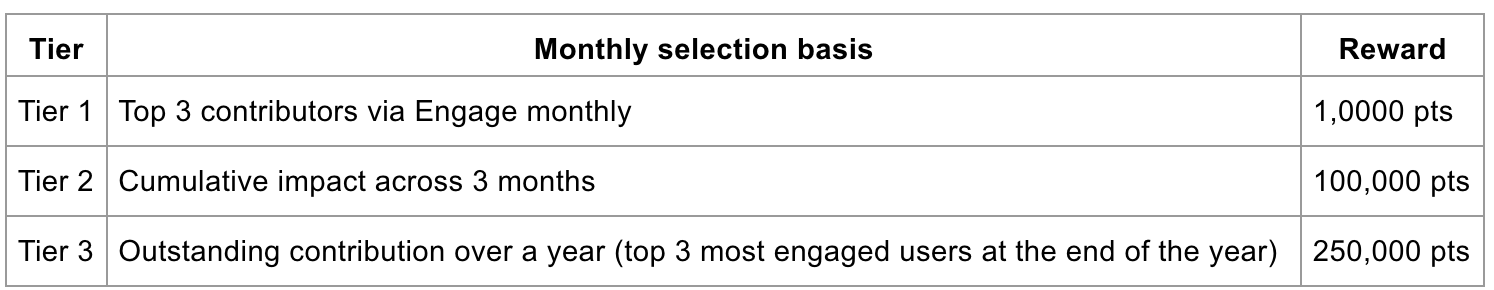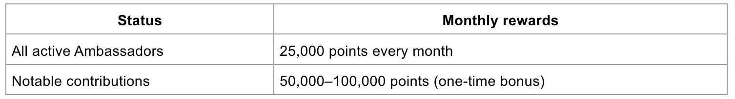 All existing Ambassadors will receive retroactive 25,000 points for past contributions. Future tiered rewards may be introduced based on continued impact.